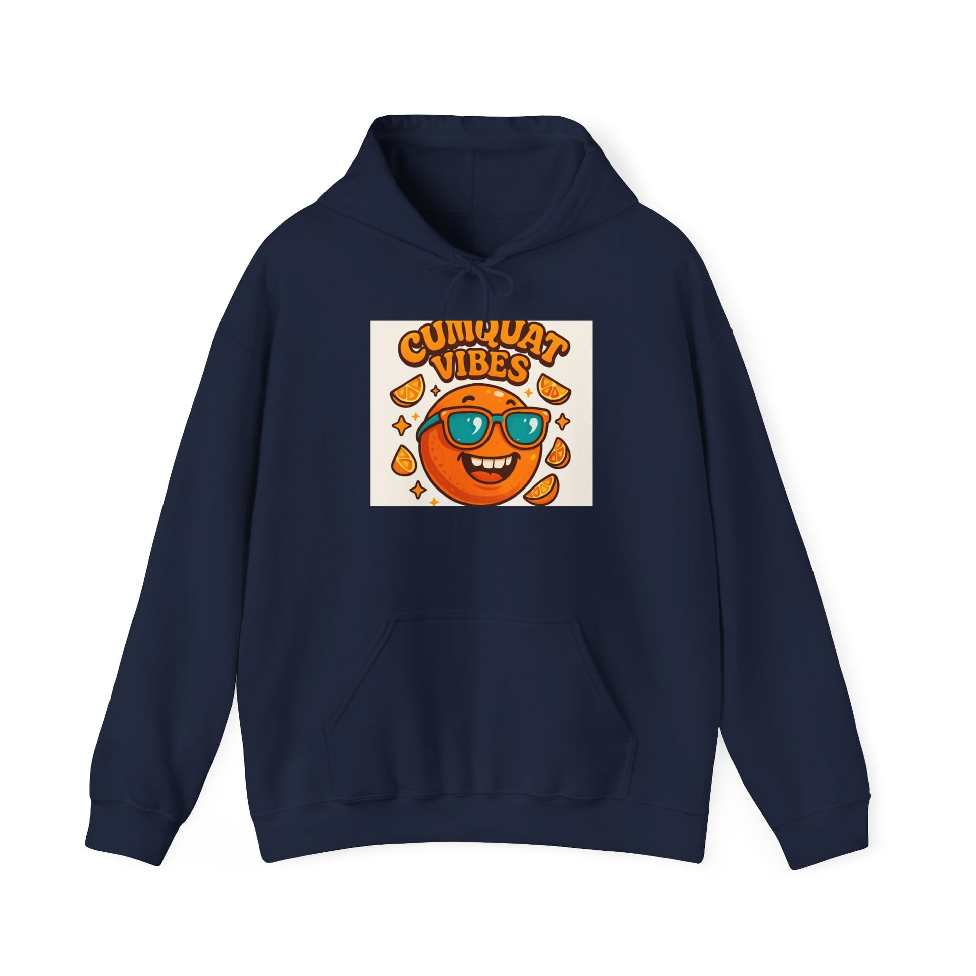 Bright, playful, and cozy — this hoodie brings a splash of sunny energy to slow mornings and weekend hangs. The front sports a cheerful citrus character with sunglasses and the phrase “Cunquat Vibes,” printed in warm orange tones that pop against the soft white fabric. Wear it when you want something casual that still feels a little joyful: over jeans for a coffee run, layered for a stroll through the farmer’s market, or curled up at home with a book and warm drink. The roomy kangaroo pocket, double-lined hood and color-matched drawcord make it feel lived-in and reliable, while the smooth 50/50 fabric holds print detail and keeps its shape wash after wash. It’s for people who like a wink of whimsy in everyday life — folks who collect small pleasures and wear their mood on their sleeve.