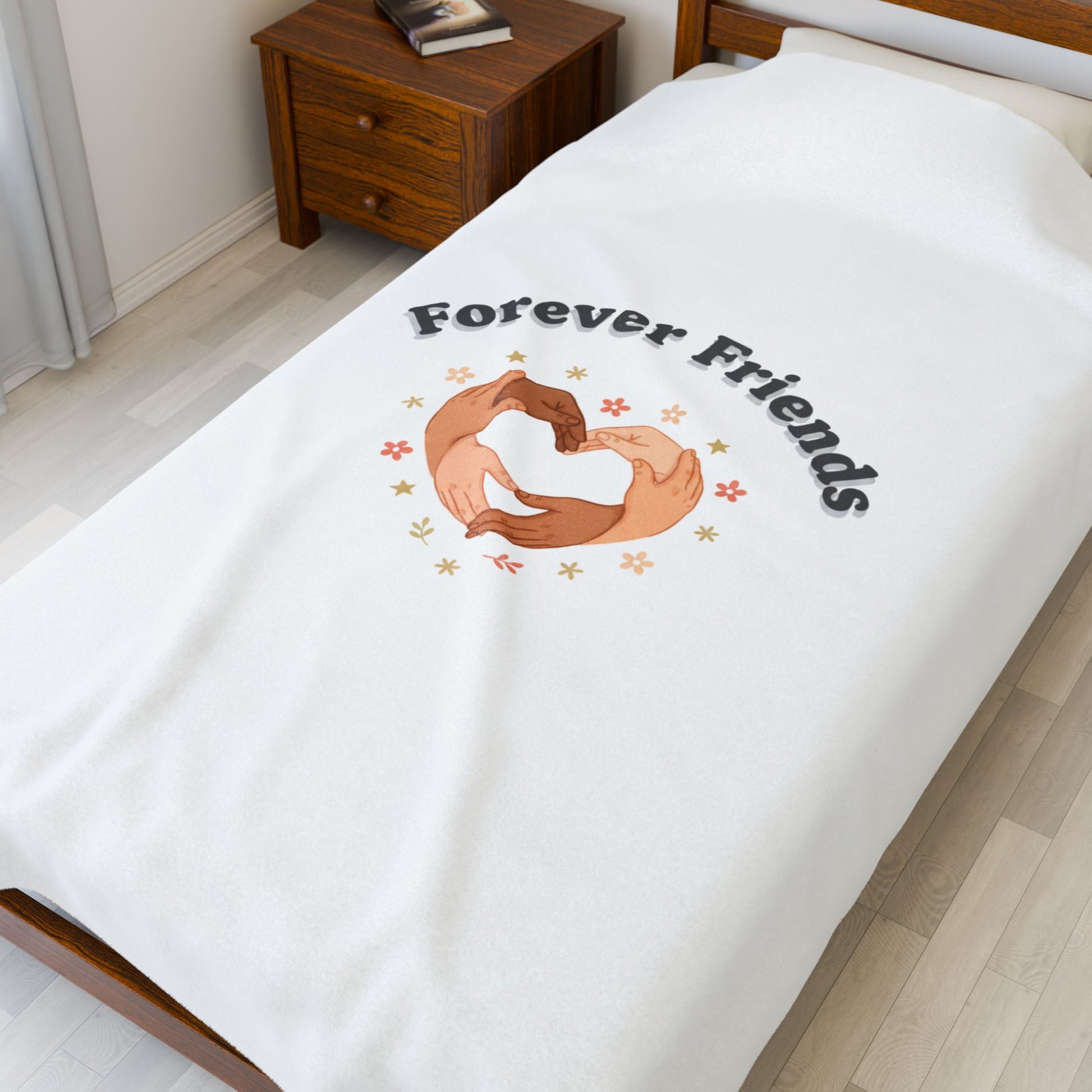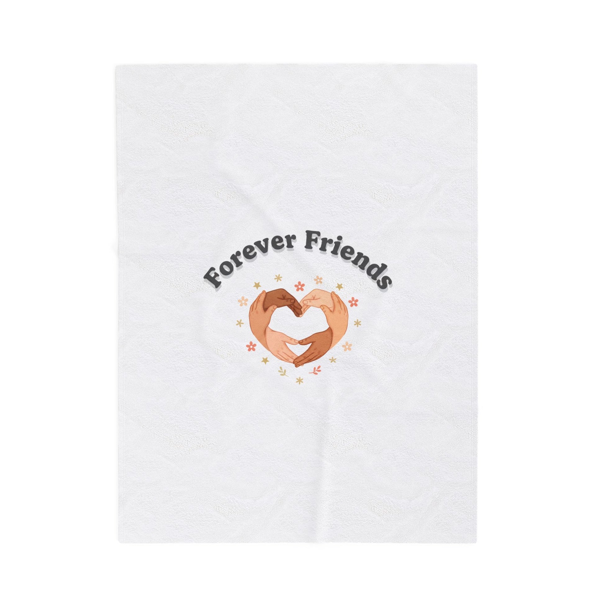 Soft, friend-focused velveteen blanket featuring two hands forming a heart and the phrase “Forever Friends” in a warm, approachable type. The simple, modern illustration and gentle palette match the Friendship Valentine trend—celebratory, platonic, and shareable—making this blanket a cozy token of communal warmth for friend circles. Lightweight enough for lounging at home or bringing to low-key meetups, the design reads as sincere and inclusive rather than romantic.