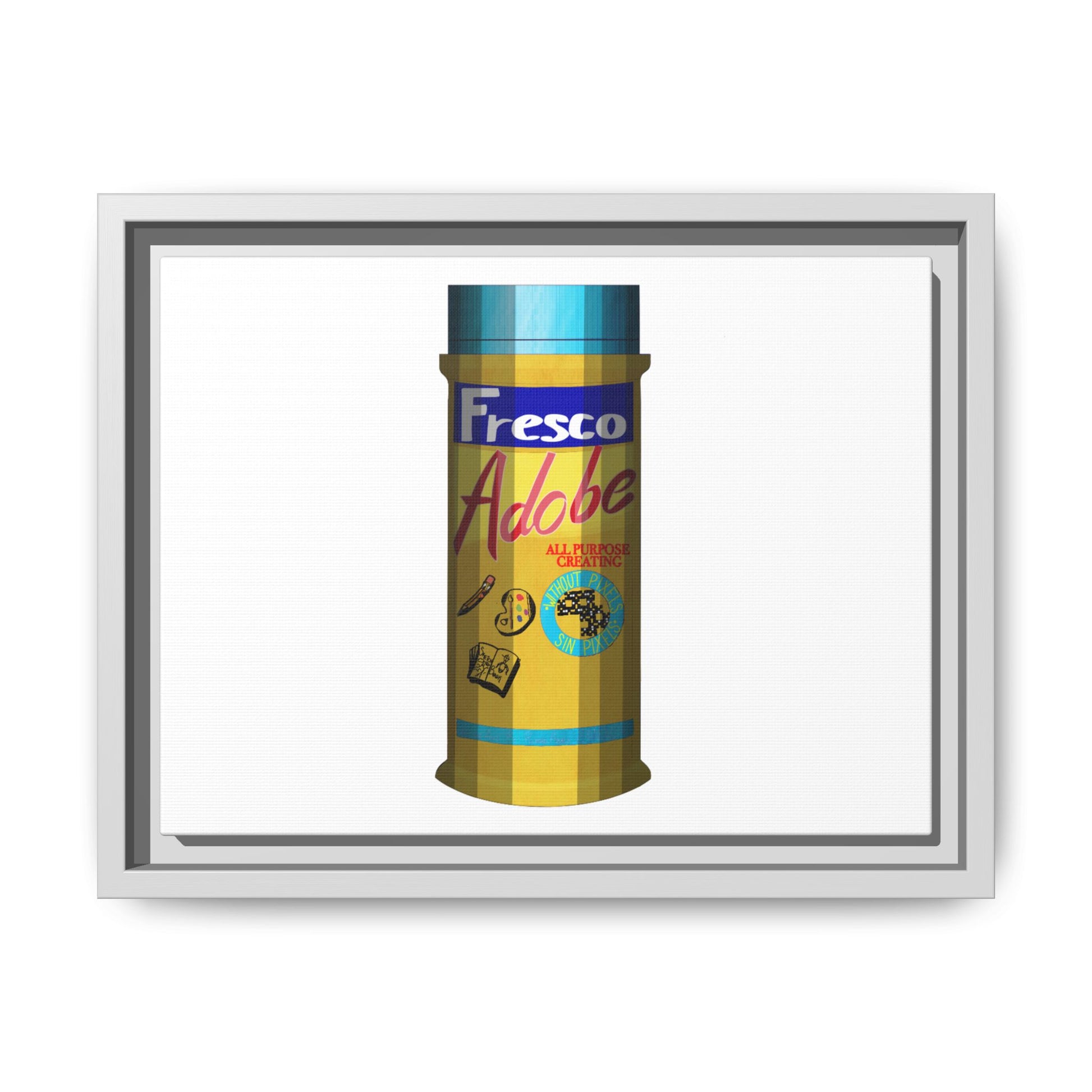 A matte canvas print with a slim framed edge that brings bold, retro color to a clean white backdrop. The piece centers on a vintage-style cylindrical canister rendered in warm golds, cool teals, and deep navy accents — a playful nod to mid-century packaging and commercial art. The matte finish mutes glare and lets the printed texture show through, while the narrow pine frame adds subtle depth and a hand-crafted feel. Hang it in a kitchen, studio, or gallery wall to introduce a pop of nostalgic color without overpowering the room.