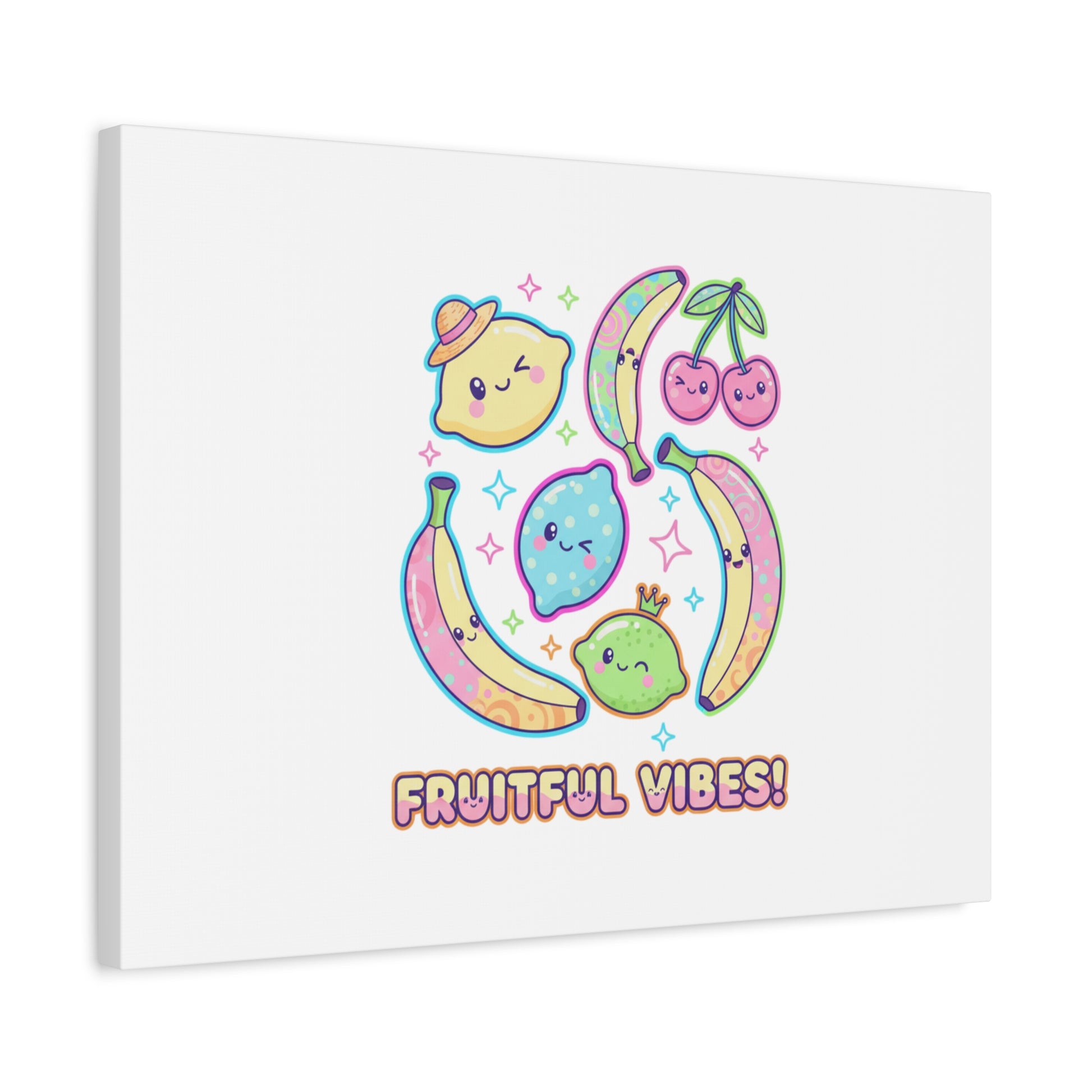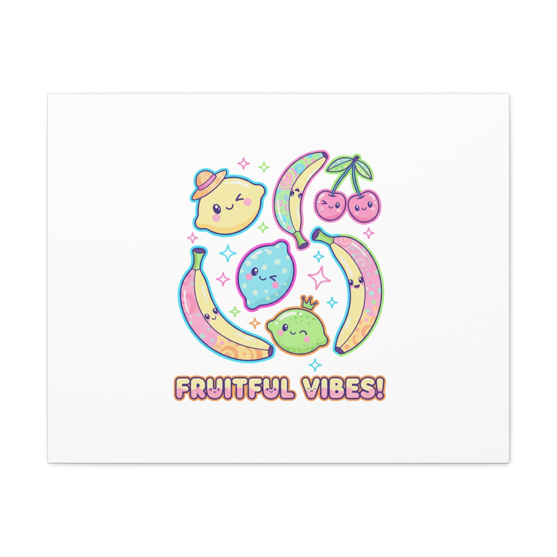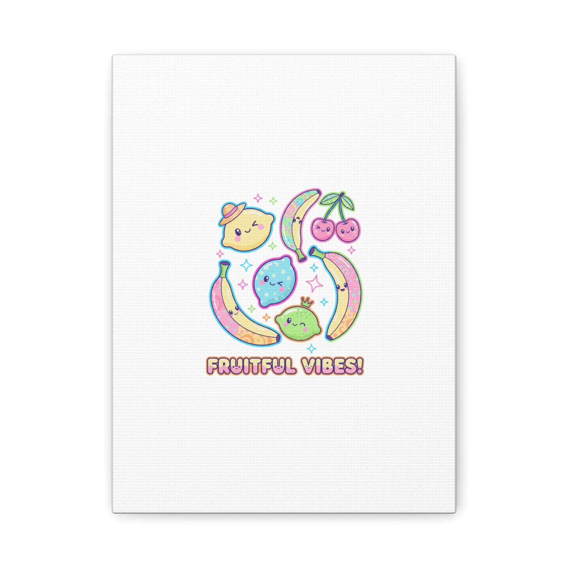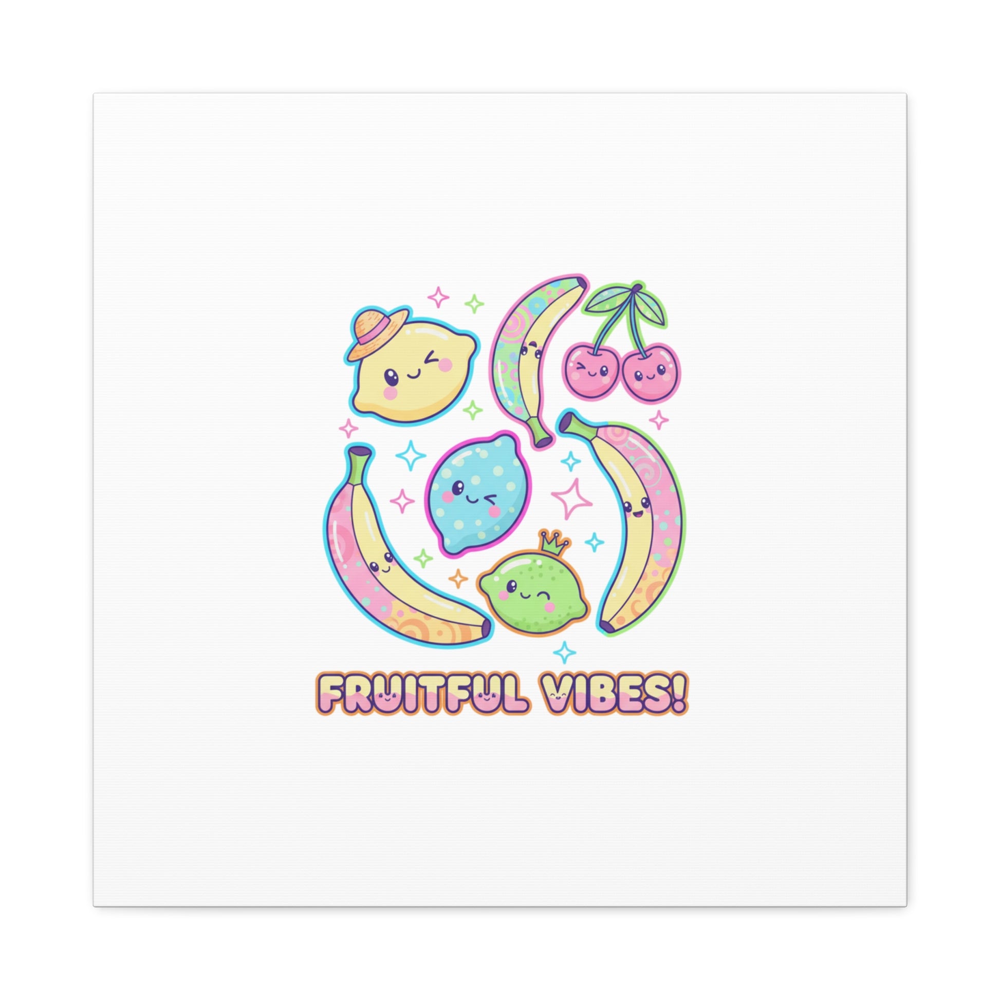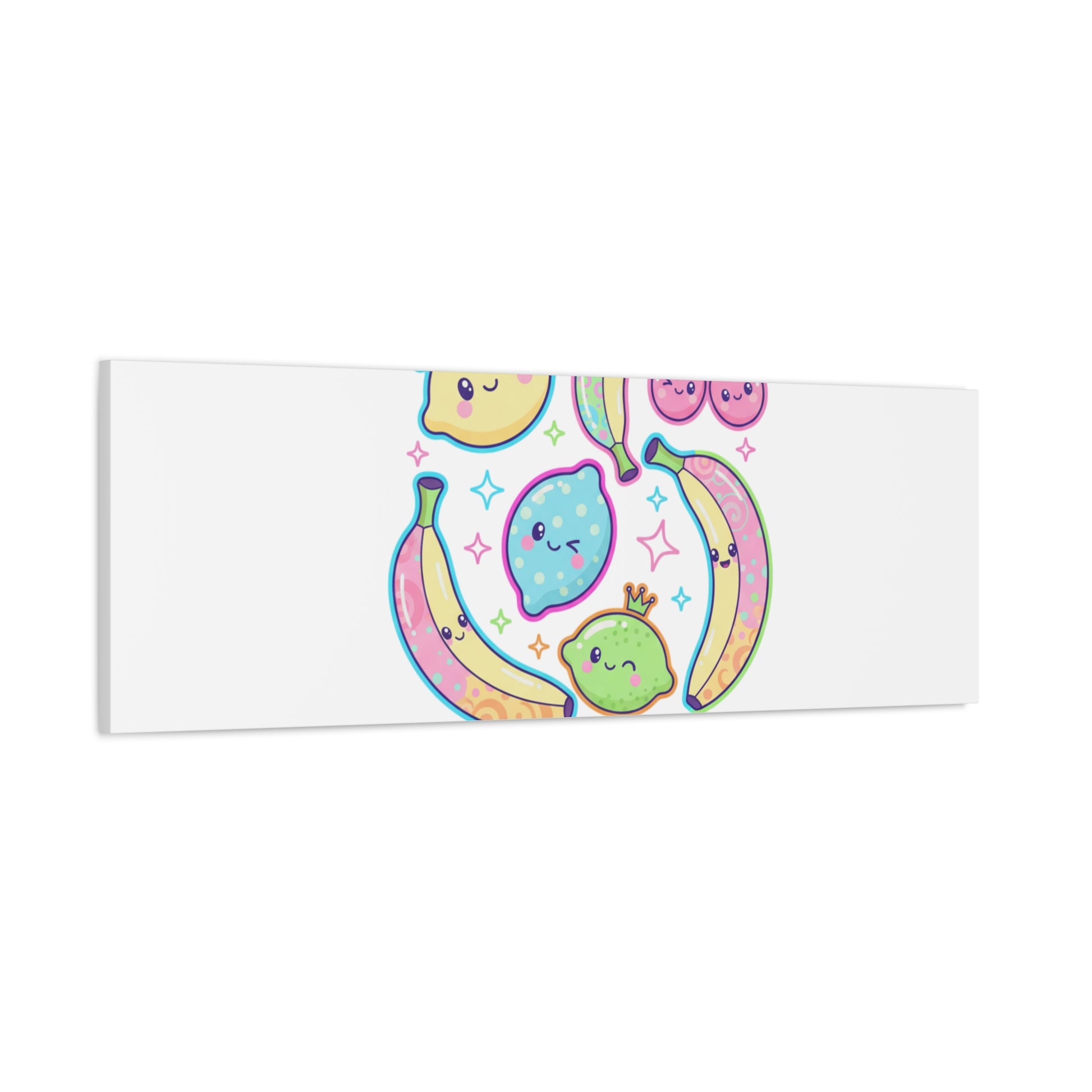 Cheerful pop-fruit canvas print that pairs pastel neons and rounded doodle art to bring a dopamine-boosting accent to walls. The artwork shows smiling bananas, cherries, and citrus characters arranged in a playful cluster with sparkling accents and a short, snackable label—aligned with pop fruit prints and slice-print, retro-pop aesthetics. Printed on a matte stretched canvas, it reads as lighthearted, summery decor that lifts mood in kitchens, dorms, or casual living spaces.