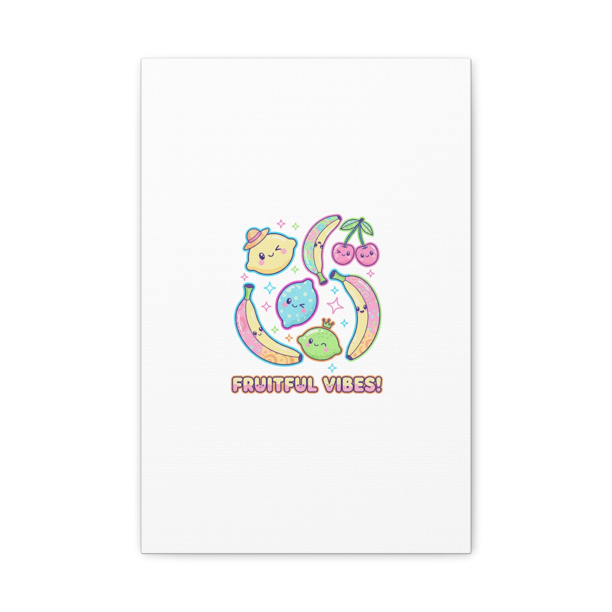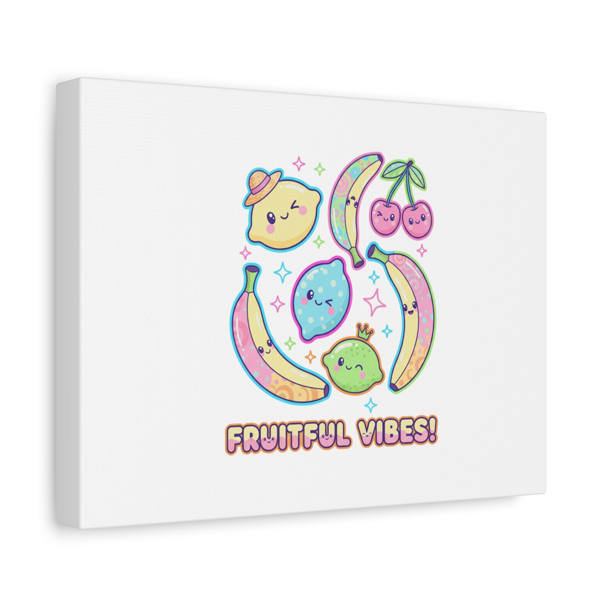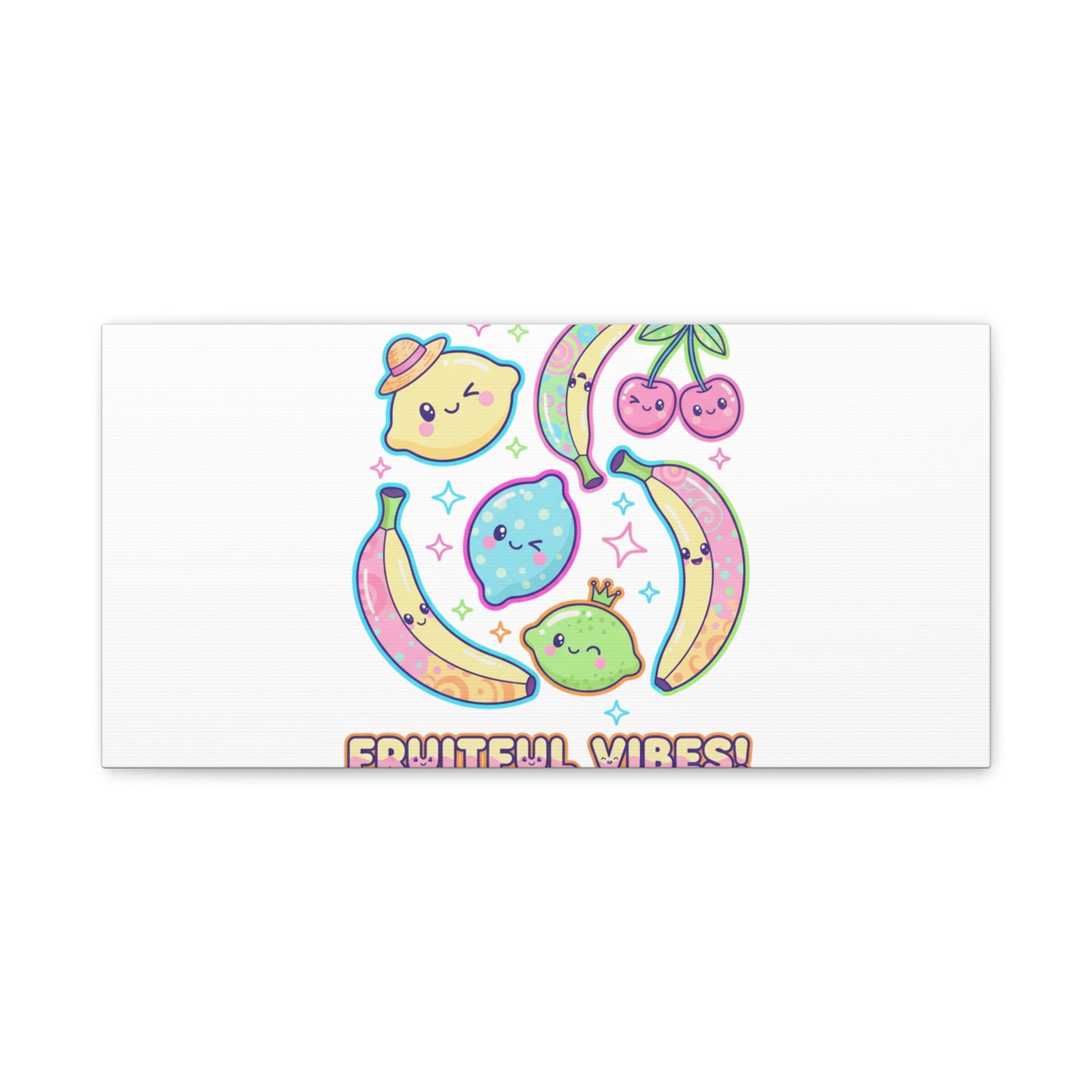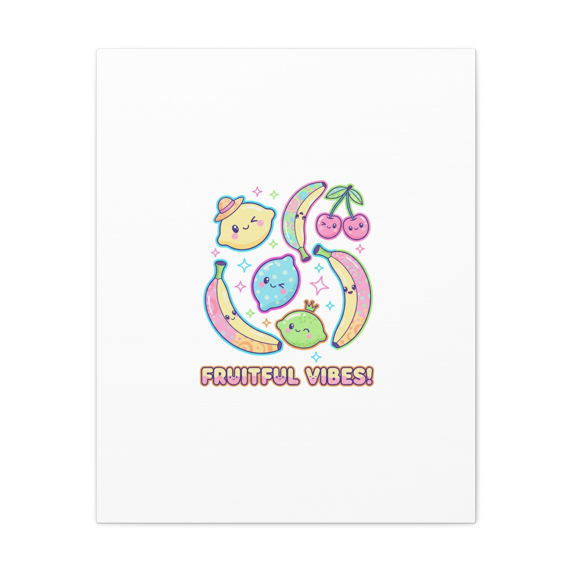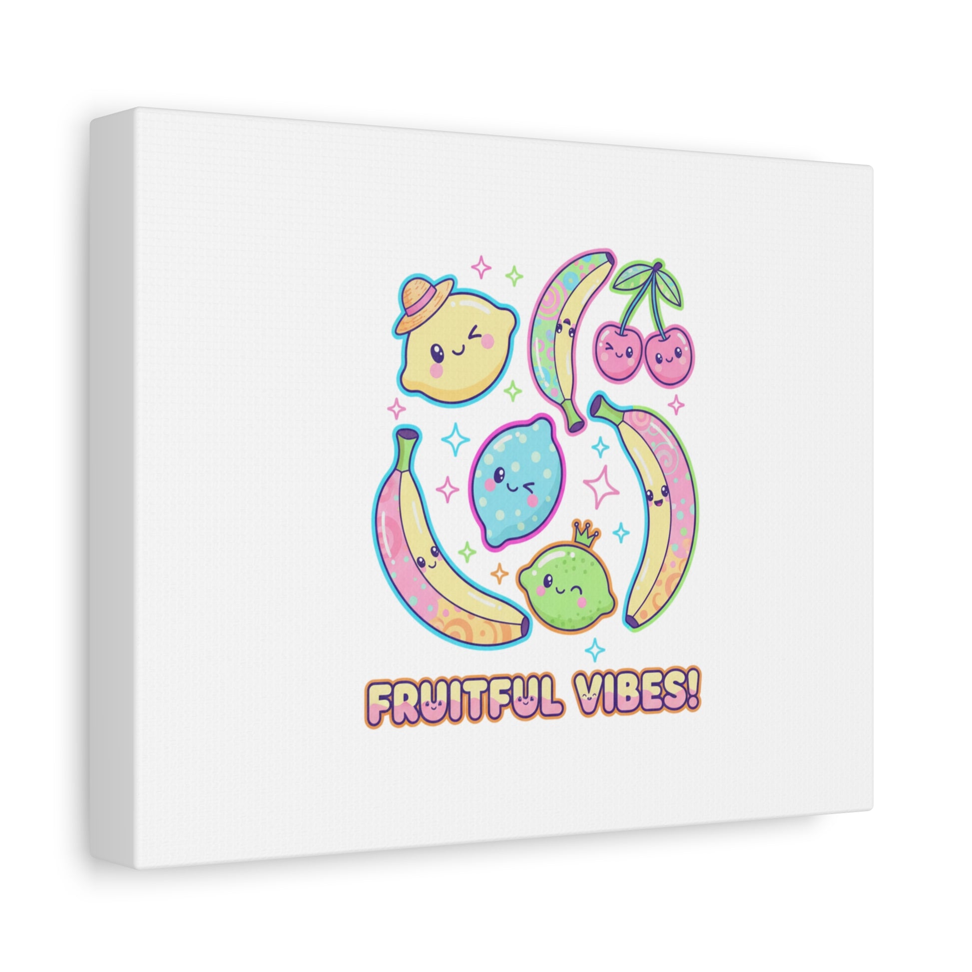 Cheerful pop-fruit canvas print that pairs pastel neons and rounded doodle art to bring a dopamine-boosting accent to walls. The artwork shows smiling bananas, cherries, and citrus characters arranged in a playful cluster with sparkling accents and a short, snackable label—aligned with pop fruit prints and slice-print, retro-pop aesthetics. Printed on a matte stretched canvas, it reads as lighthearted, summery decor that lifts mood in kitchens, dorms, or casual living spaces.