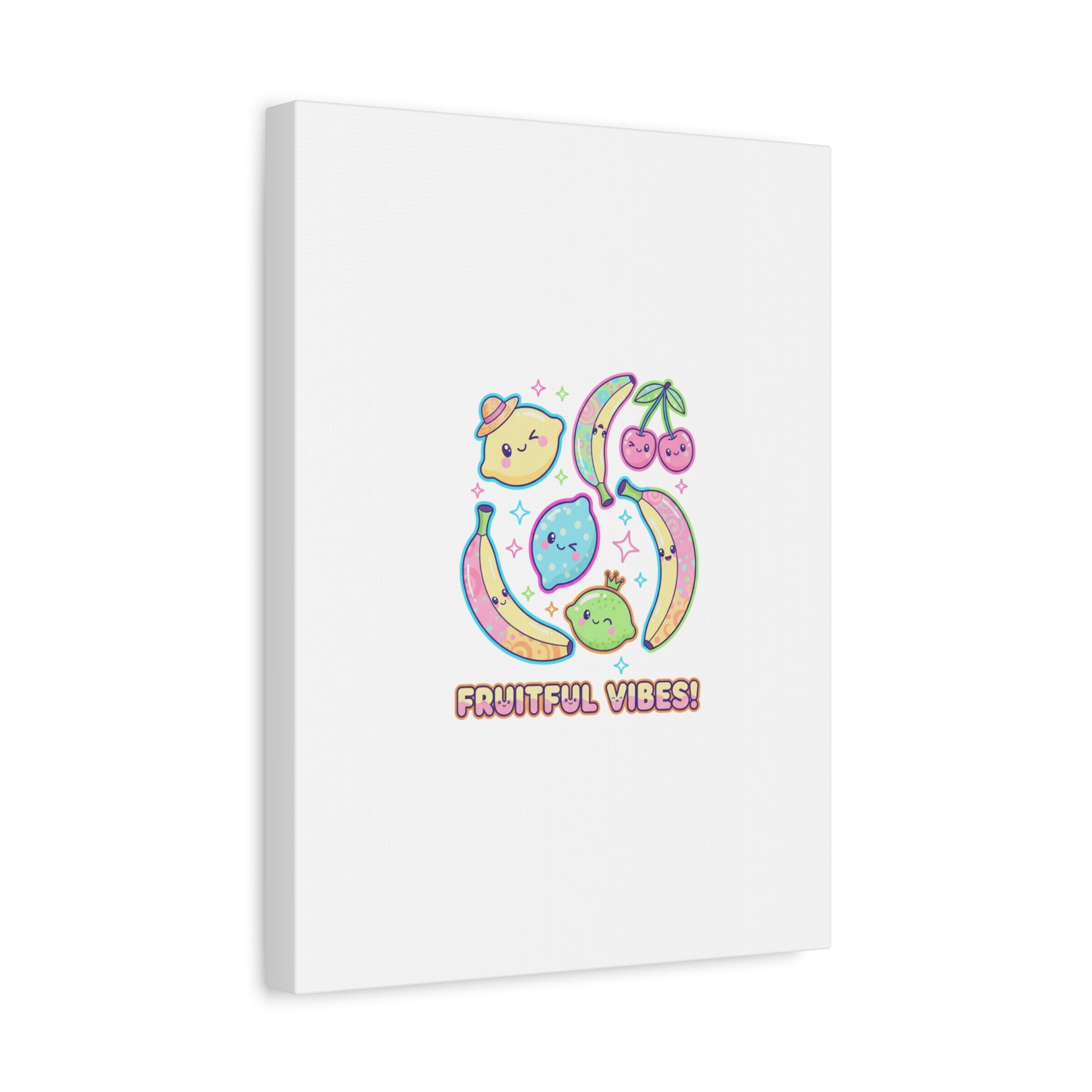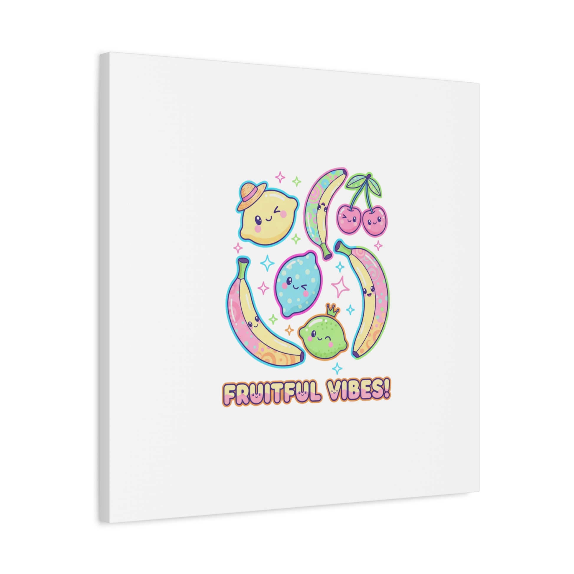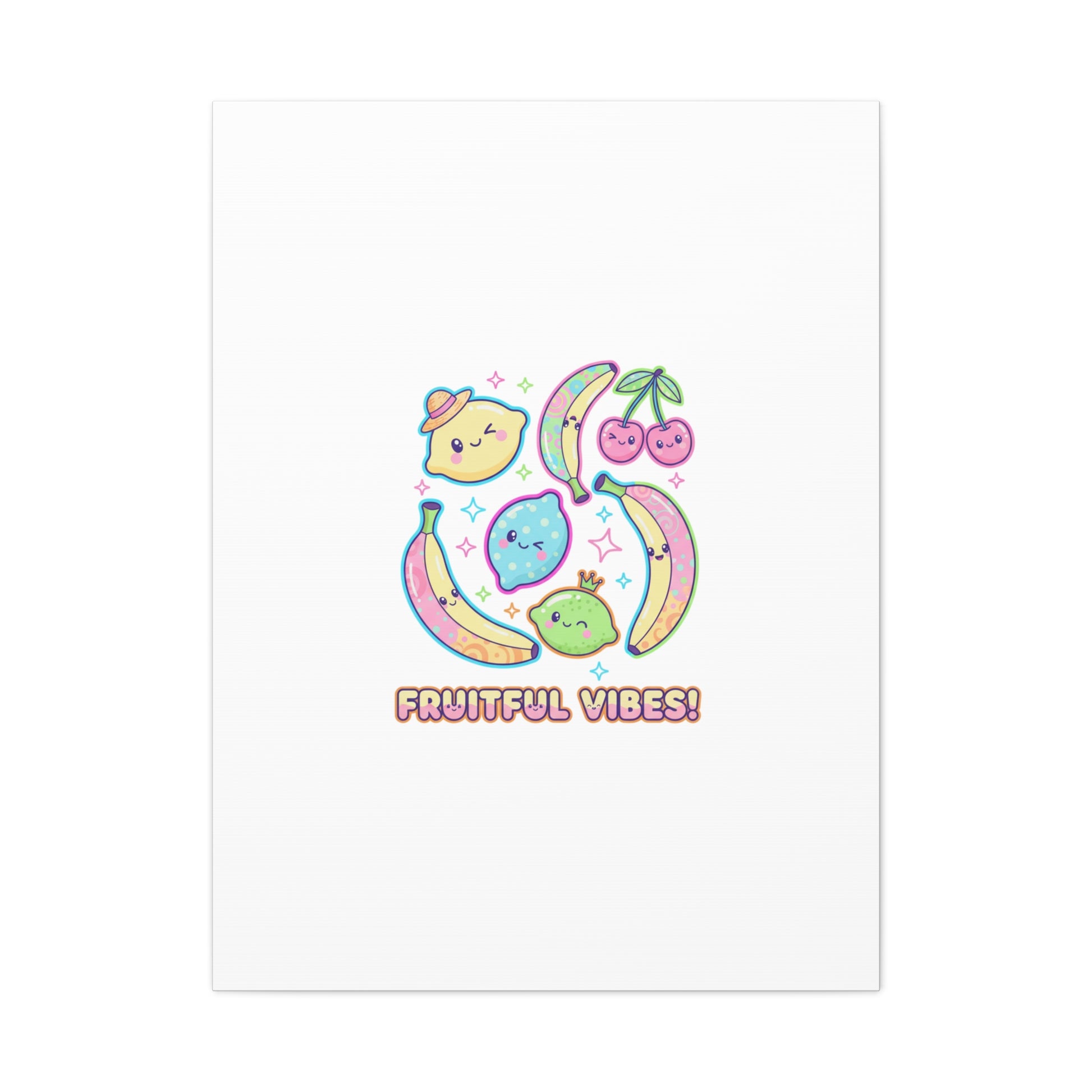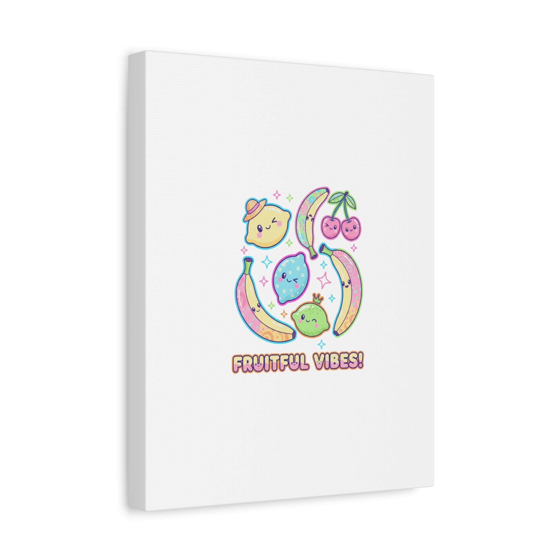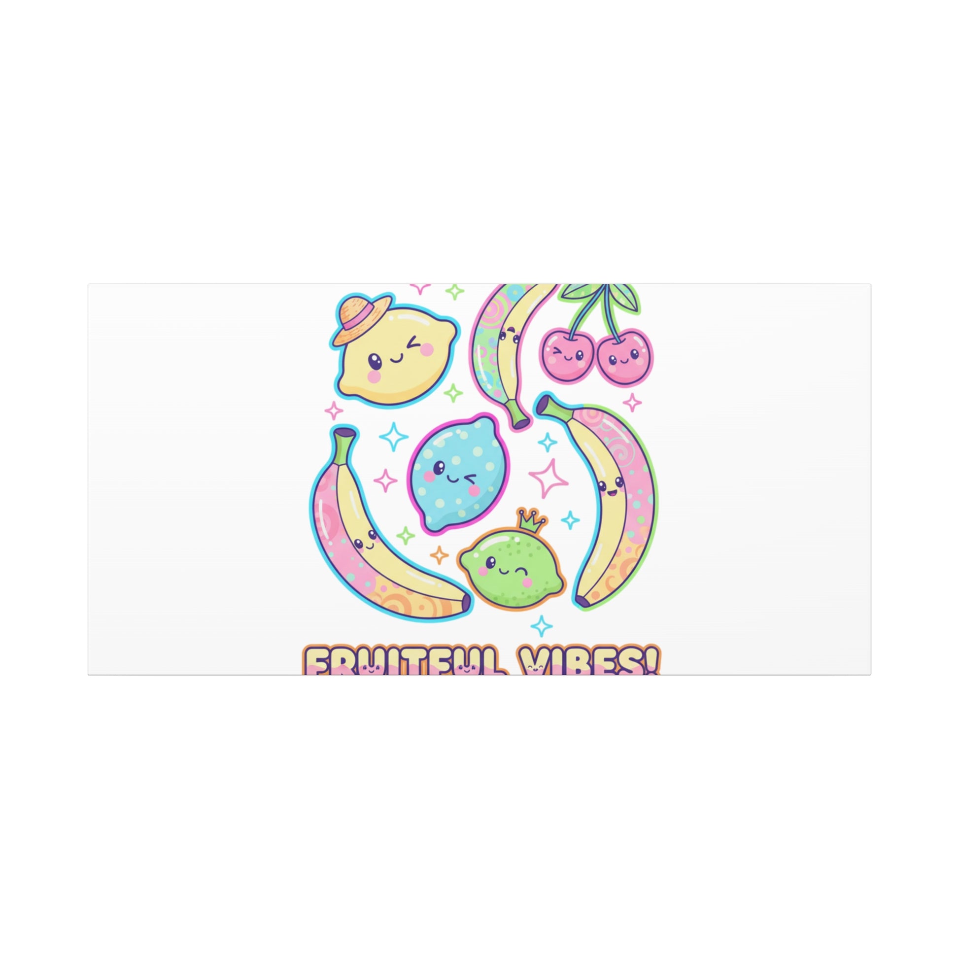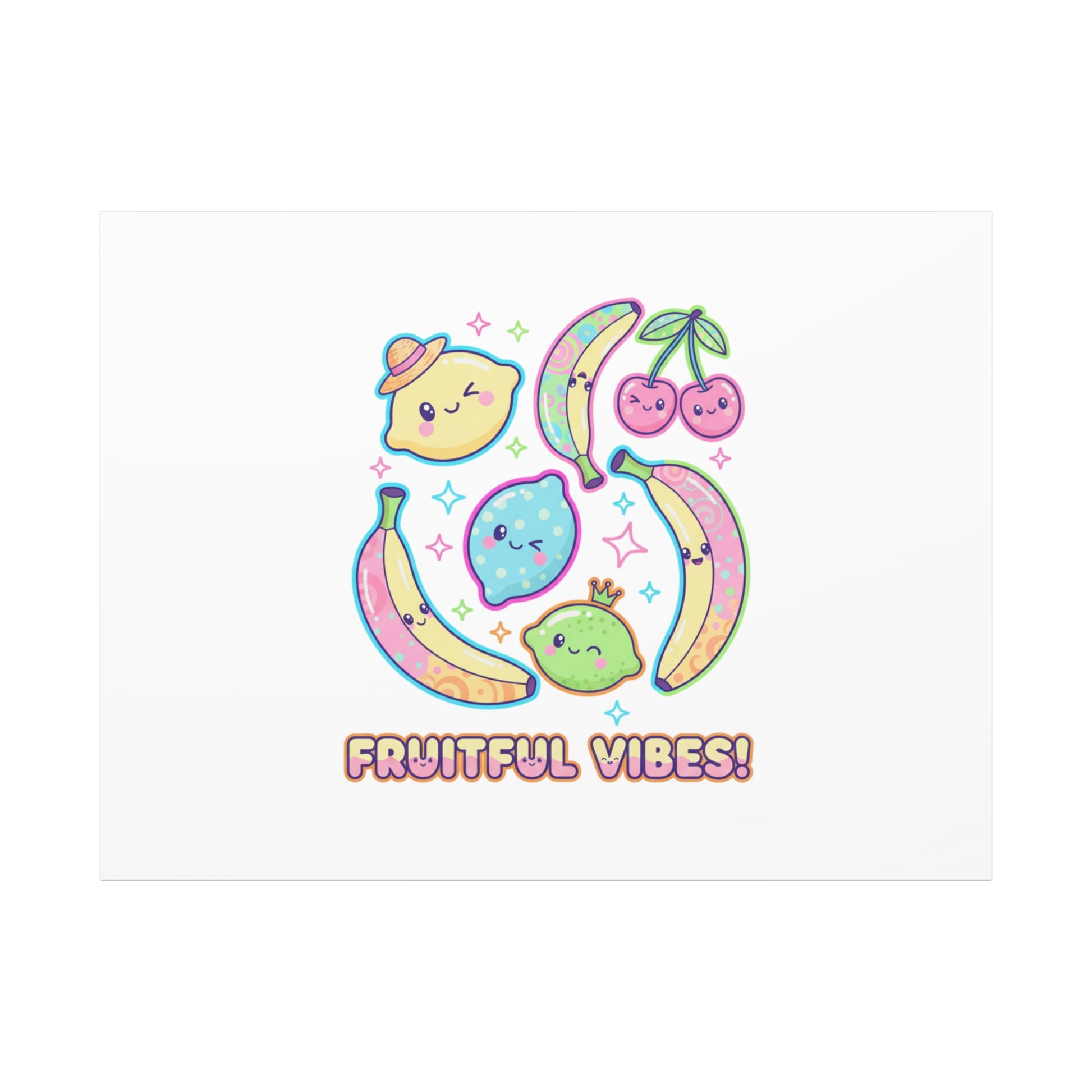 Cheerful pop-fruit canvas print that pairs pastel neons and rounded doodle art to bring a dopamine-boosting accent to walls. The artwork shows smiling bananas, cherries, and citrus characters arranged in a playful cluster with sparkling accents and a short, snackable label—aligned with pop fruit prints and slice-print, retro-pop aesthetics. Printed on a matte stretched canvas, it reads as lighthearted, summery decor that lifts mood in kitchens, dorms, or casual living spaces.