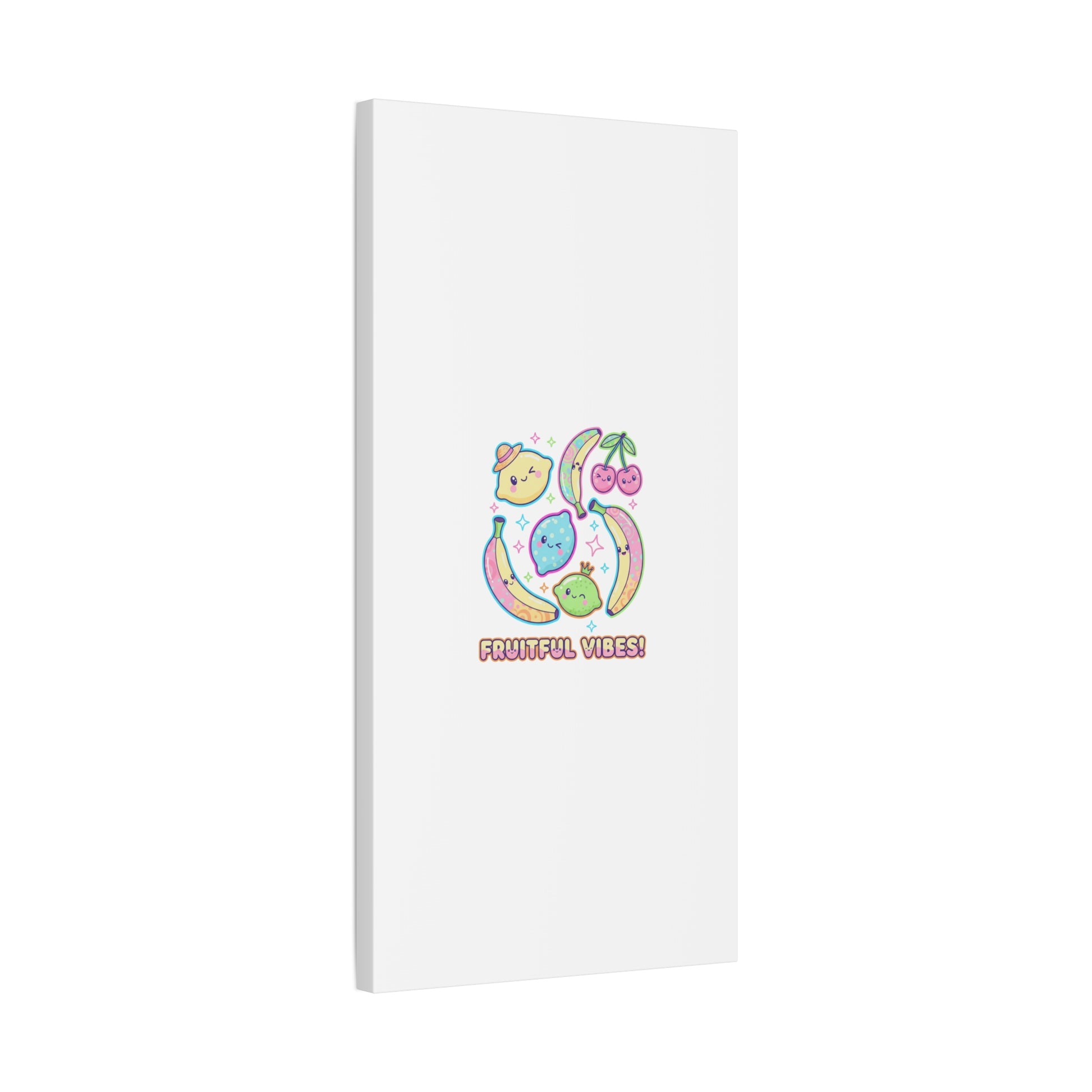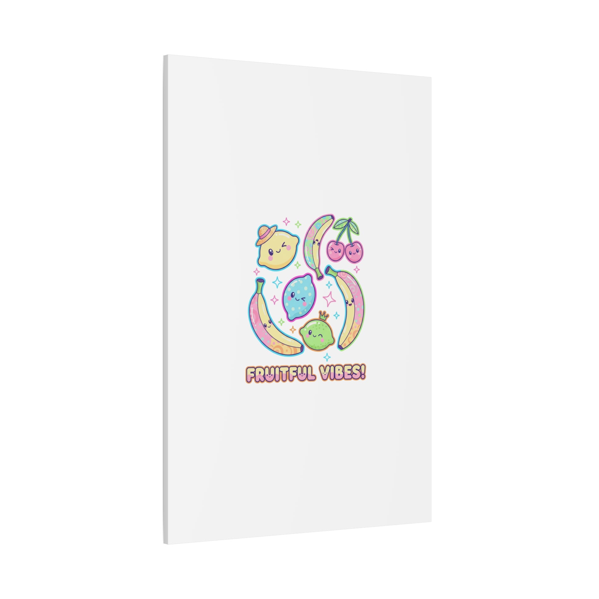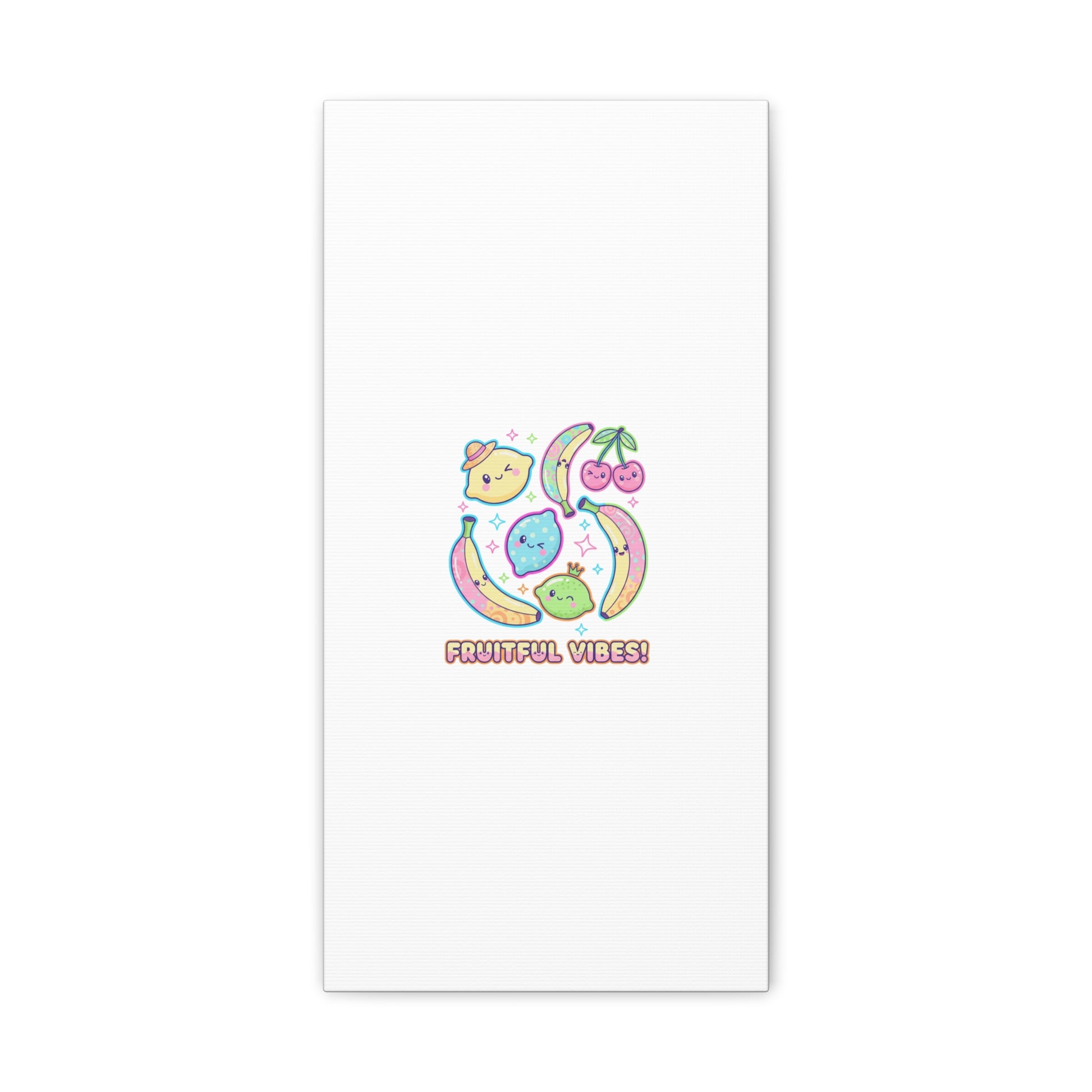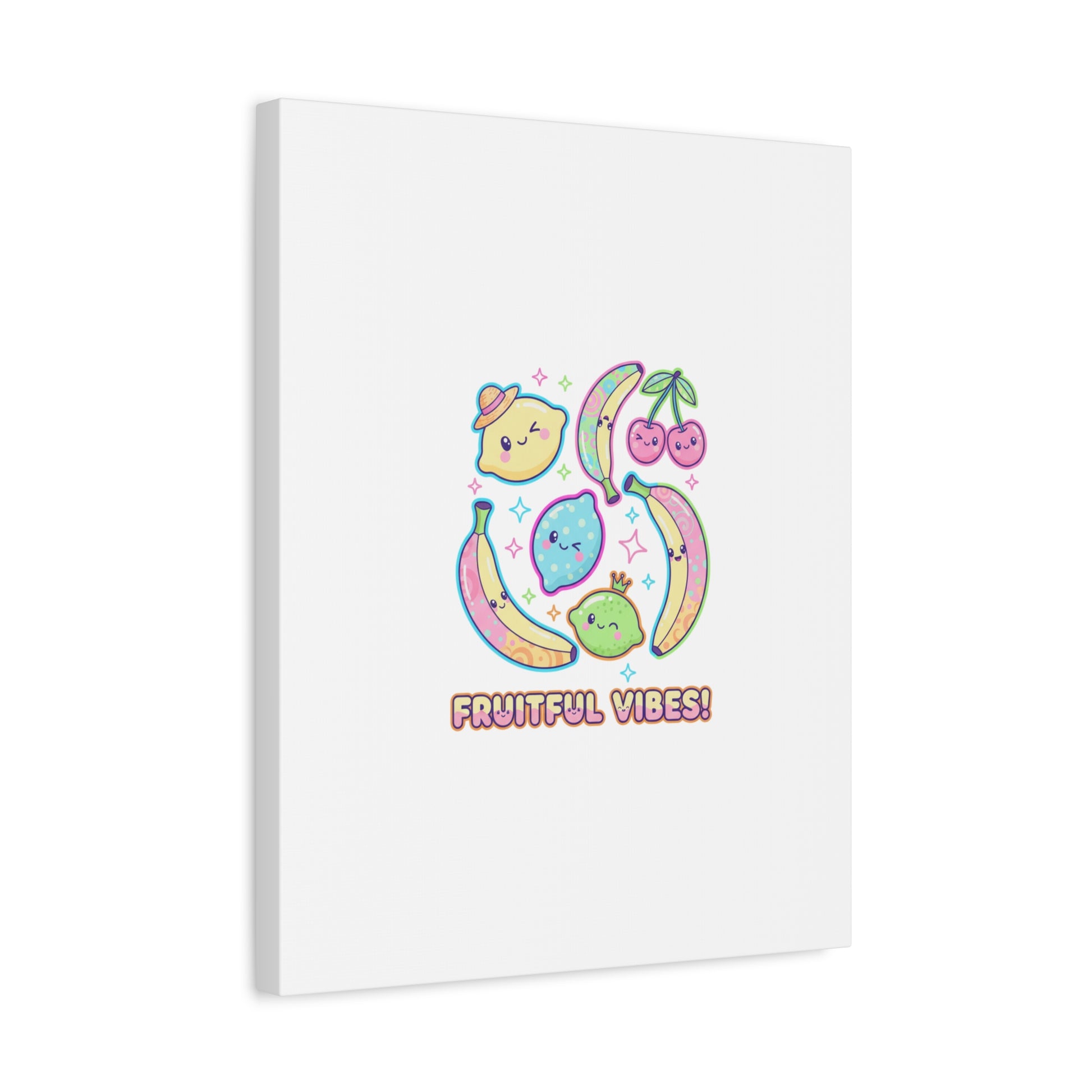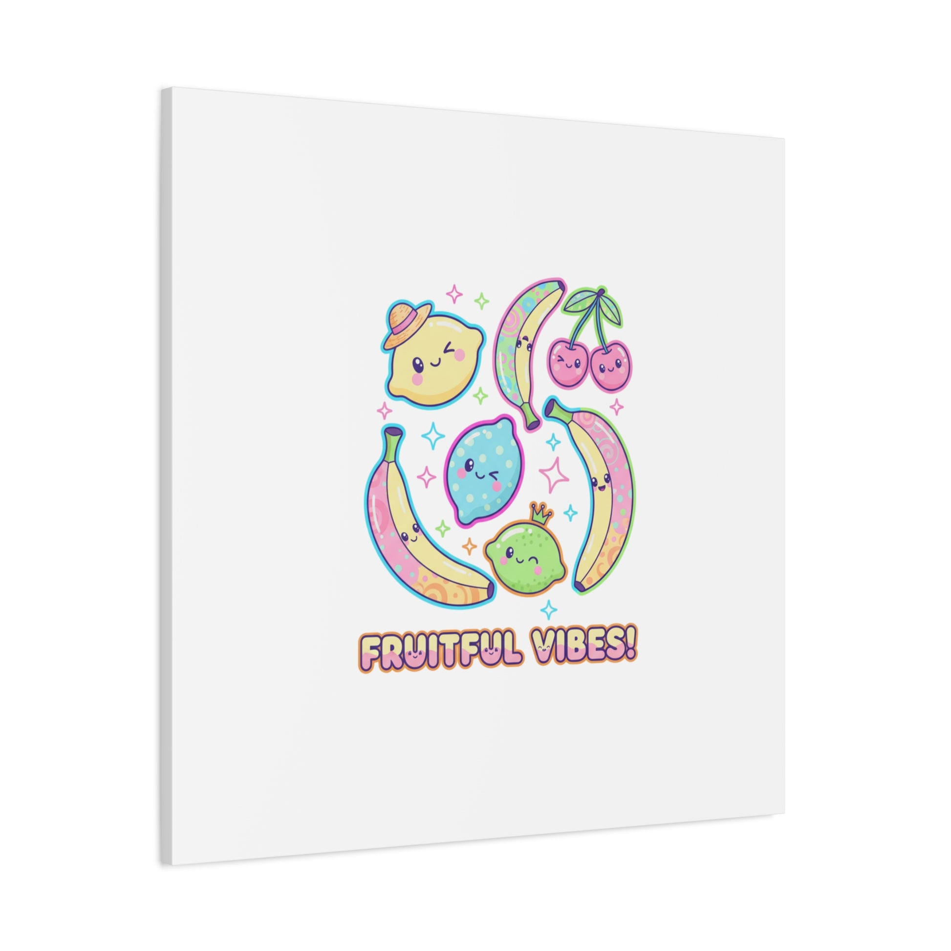 Cheerful pop-fruit canvas print that pairs pastel neons and rounded doodle art to bring a dopamine-boosting accent to walls. The artwork shows smiling bananas, cherries, and citrus characters arranged in a playful cluster with sparkling accents and a short, snackable label—aligned with pop fruit prints and slice-print, retro-pop aesthetics. Printed on a matte stretched canvas, it reads as lighthearted, summery decor that lifts mood in kitchens, dorms, or casual living spaces.