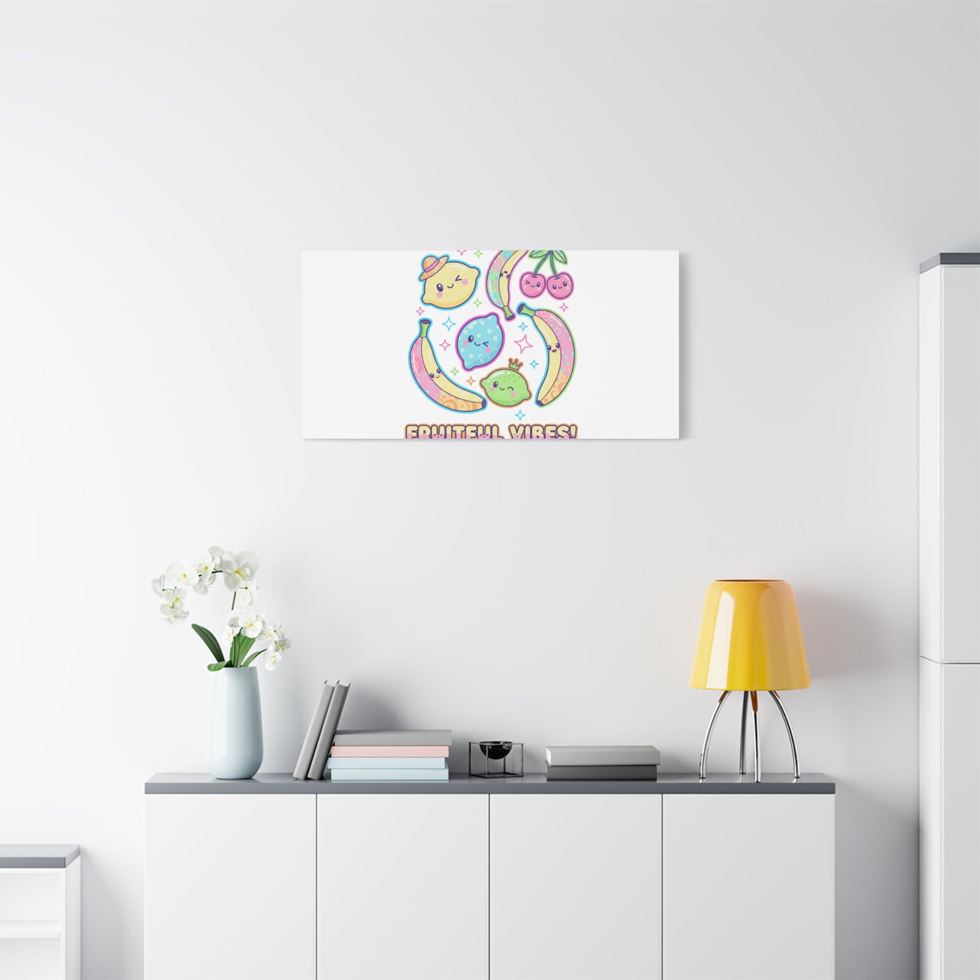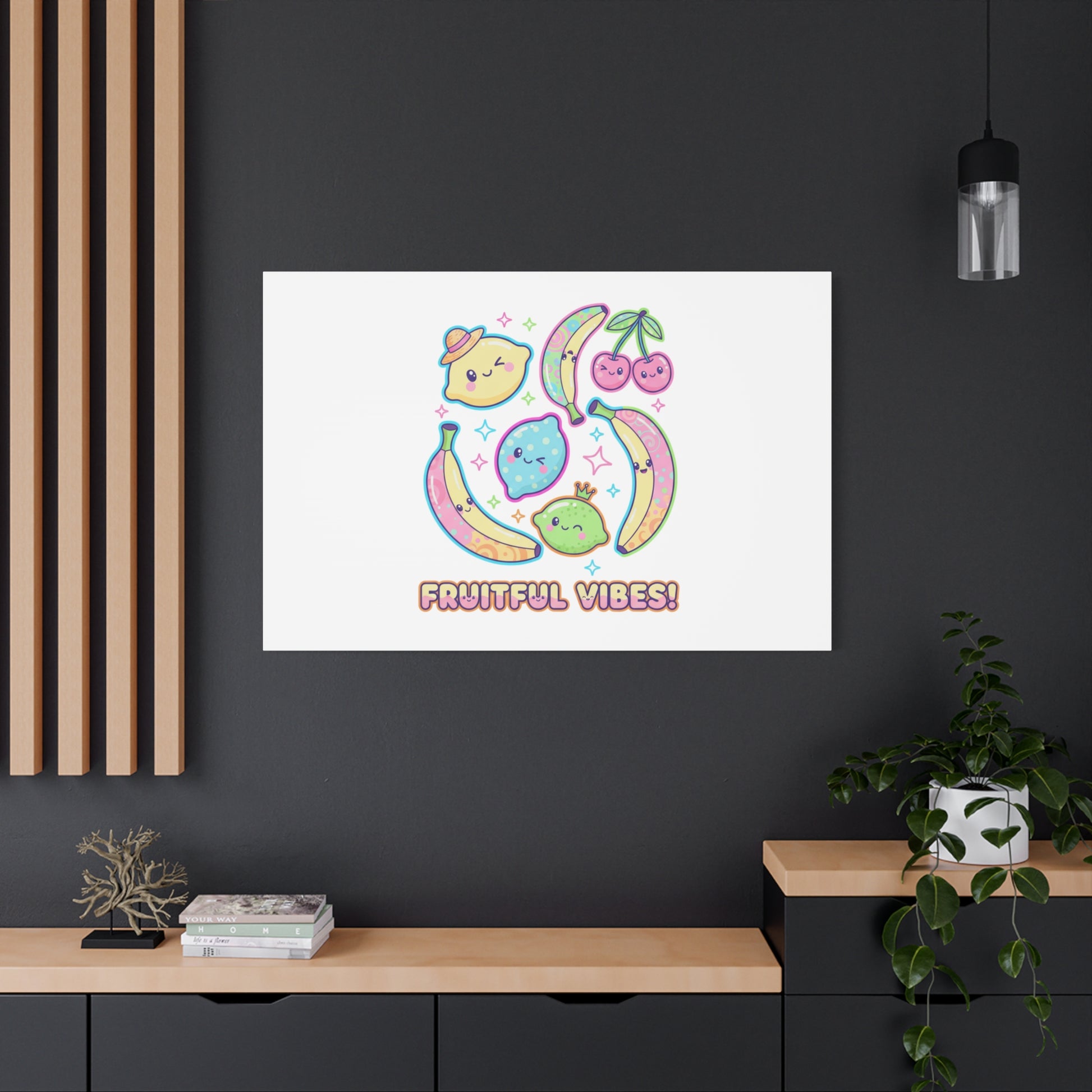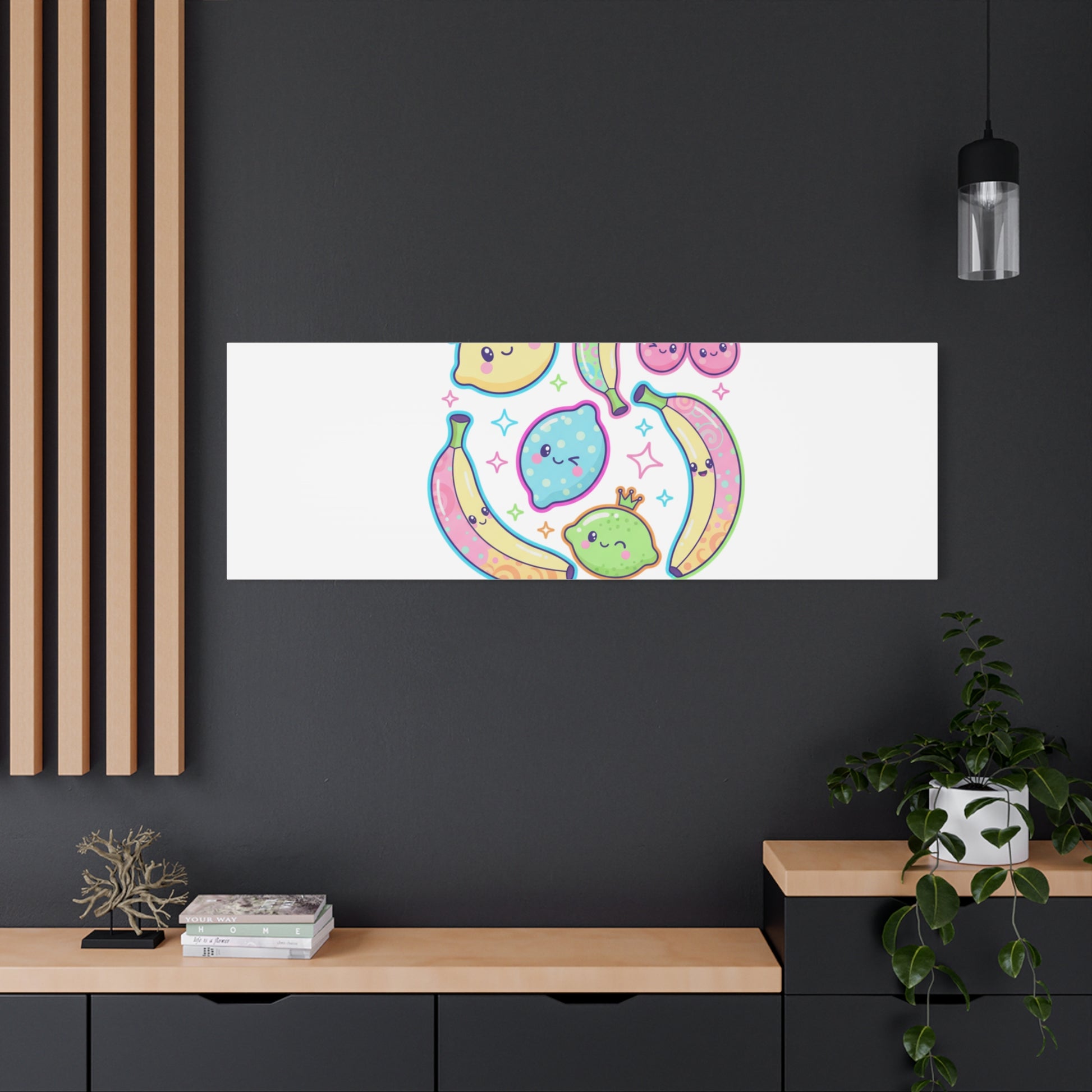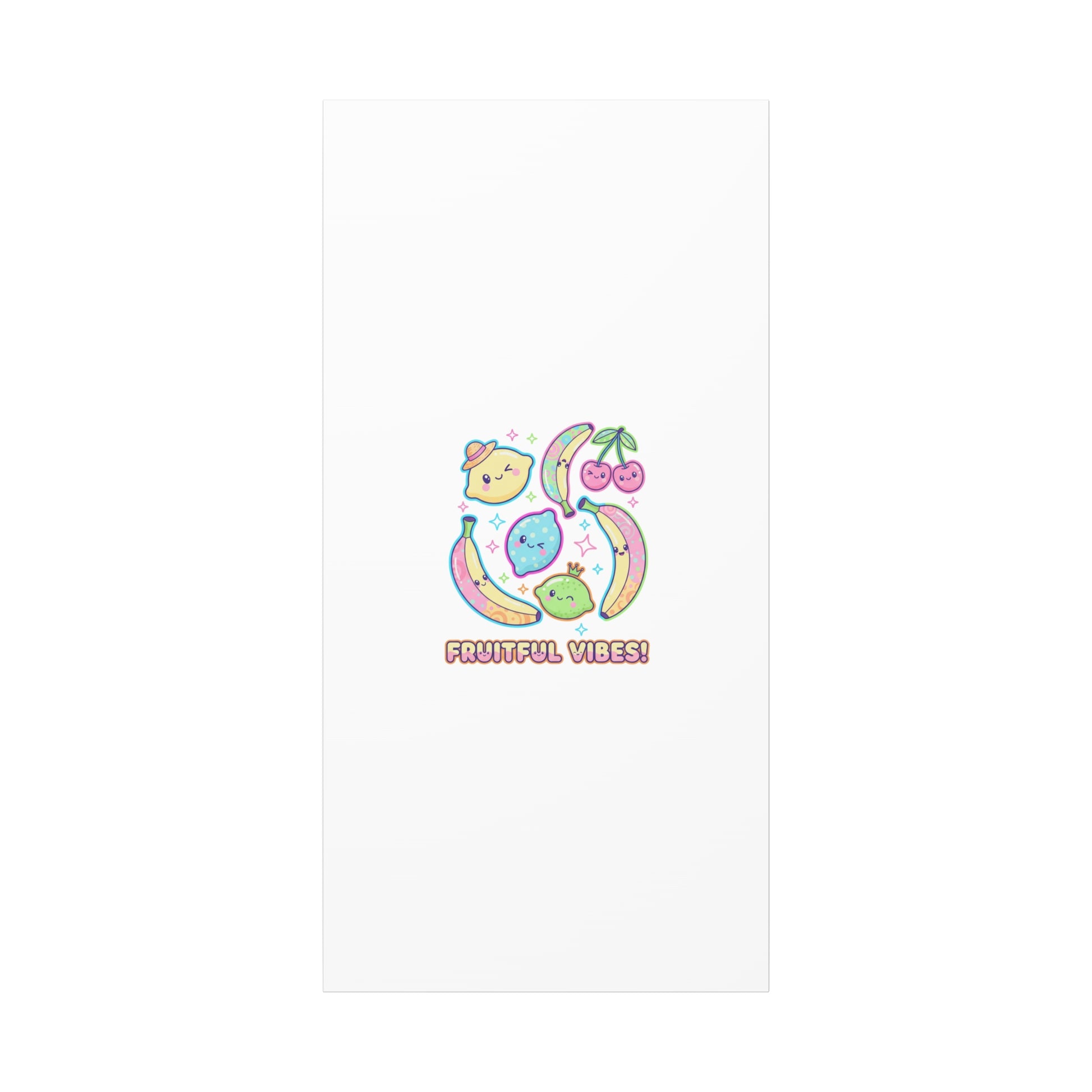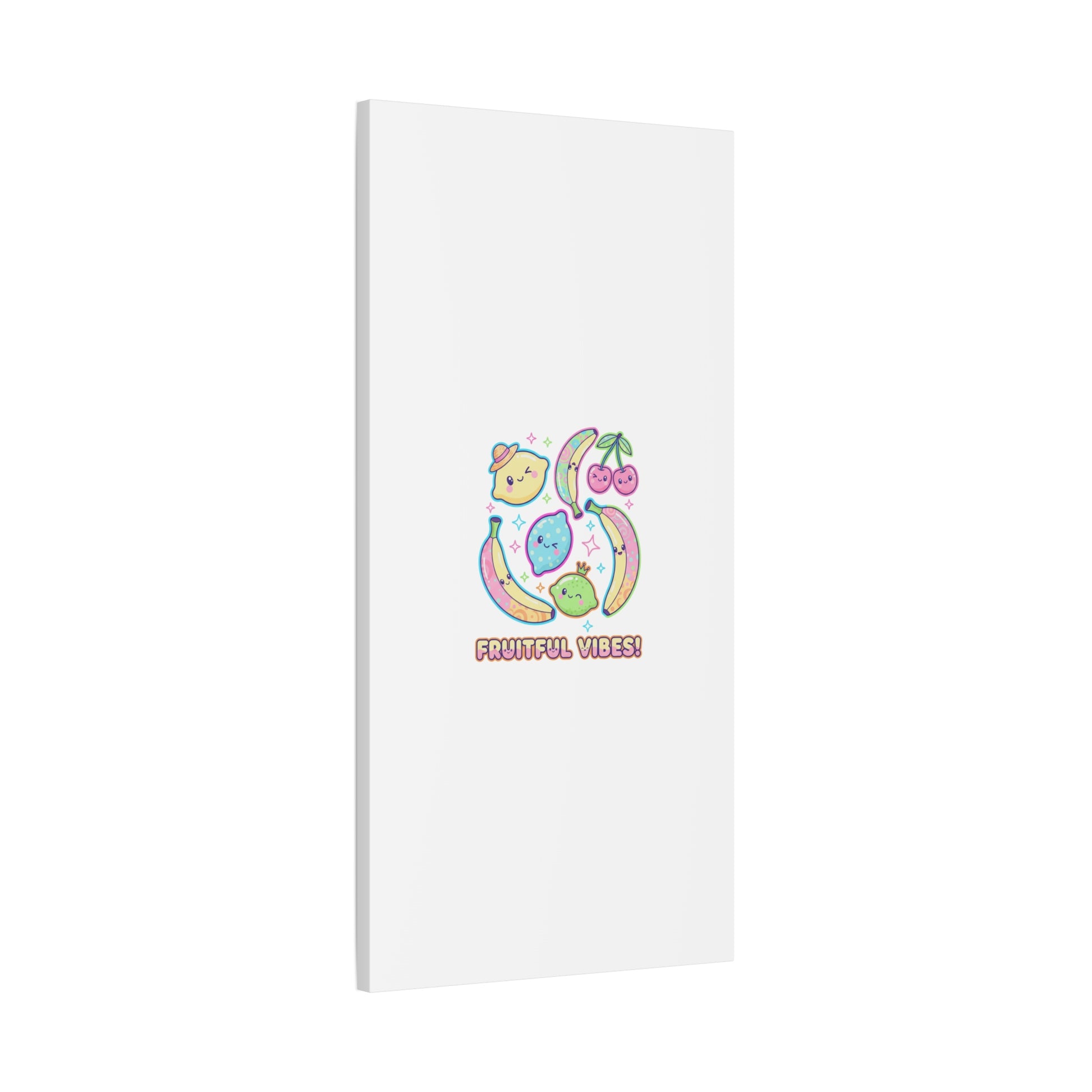 Cheerful pop-fruit canvas print that pairs pastel neons and rounded doodle art to bring a dopamine-boosting accent to walls. The artwork shows smiling bananas, cherries, and citrus characters arranged in a playful cluster with sparkling accents and a short, snackable label—aligned with pop fruit prints and slice-print, retro-pop aesthetics. Printed on a matte stretched canvas, it reads as lighthearted, summery decor that lifts mood in kitchens, dorms, or casual living spaces.