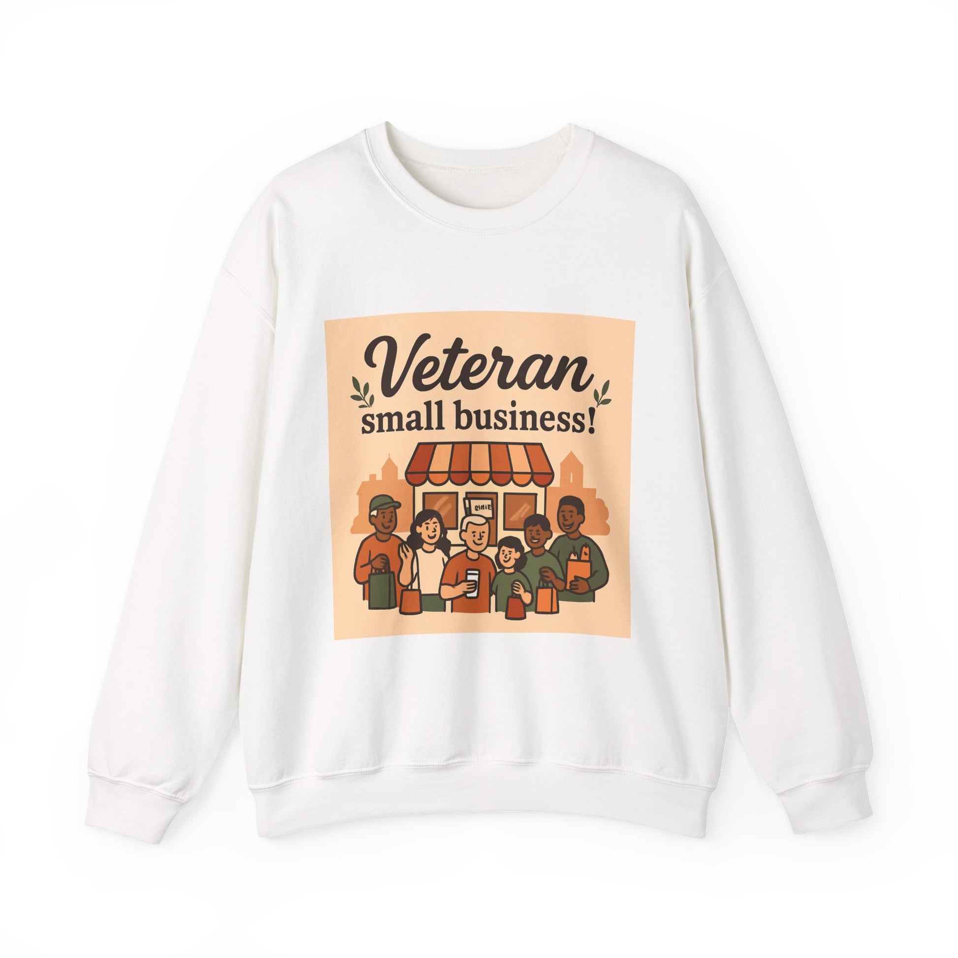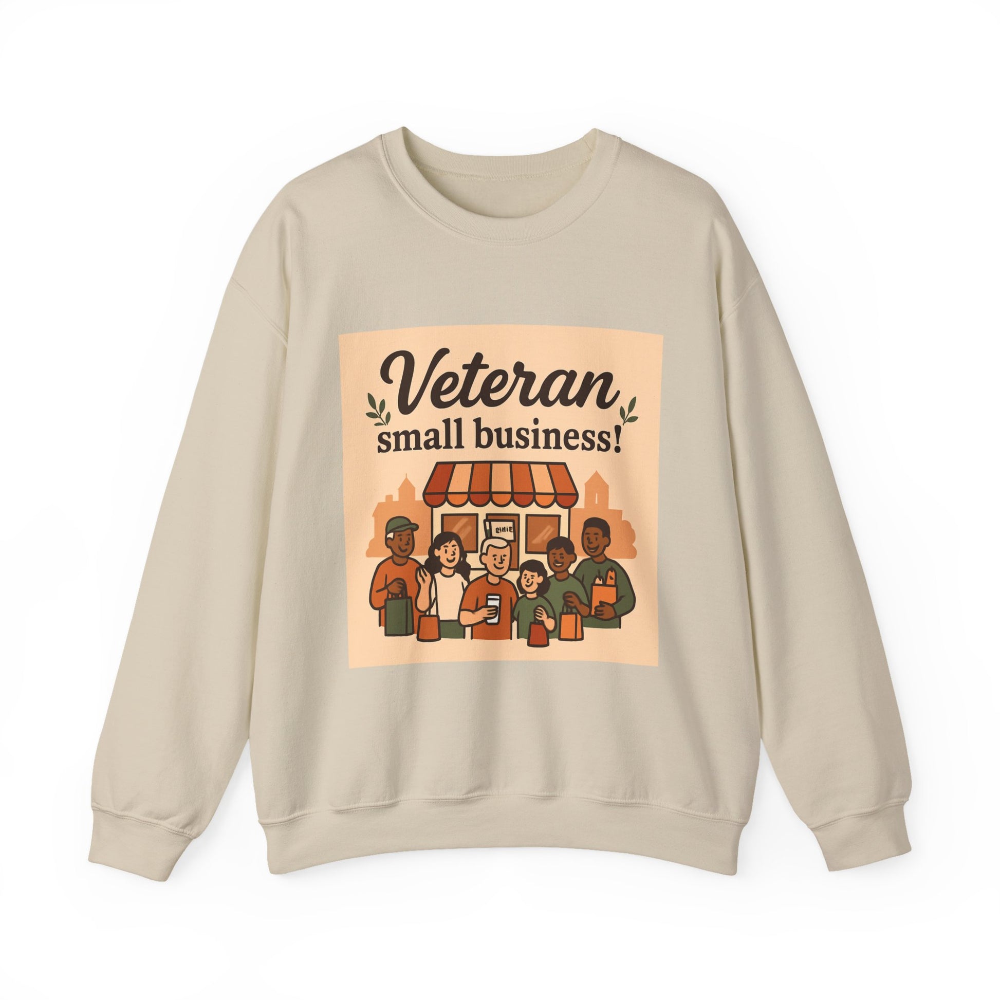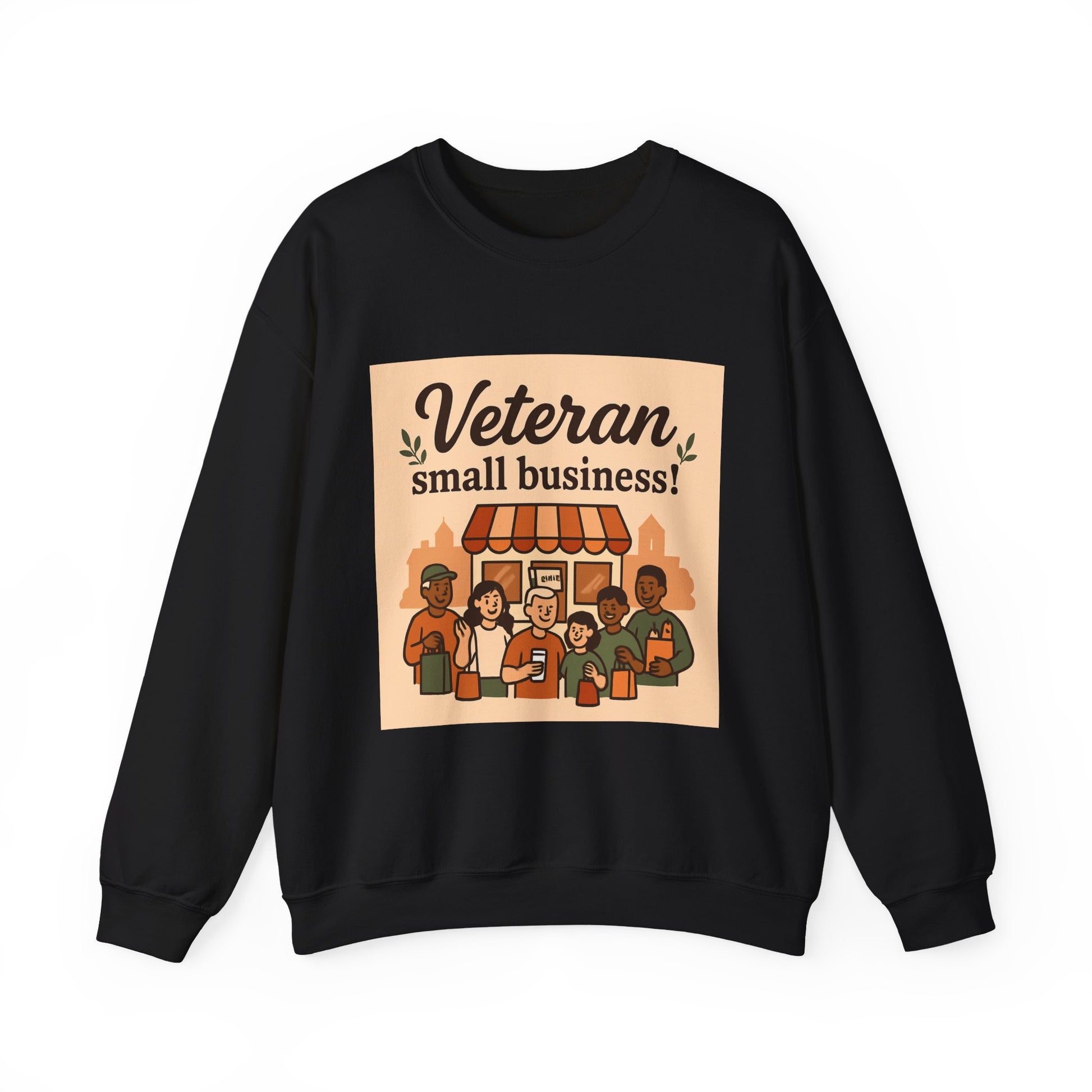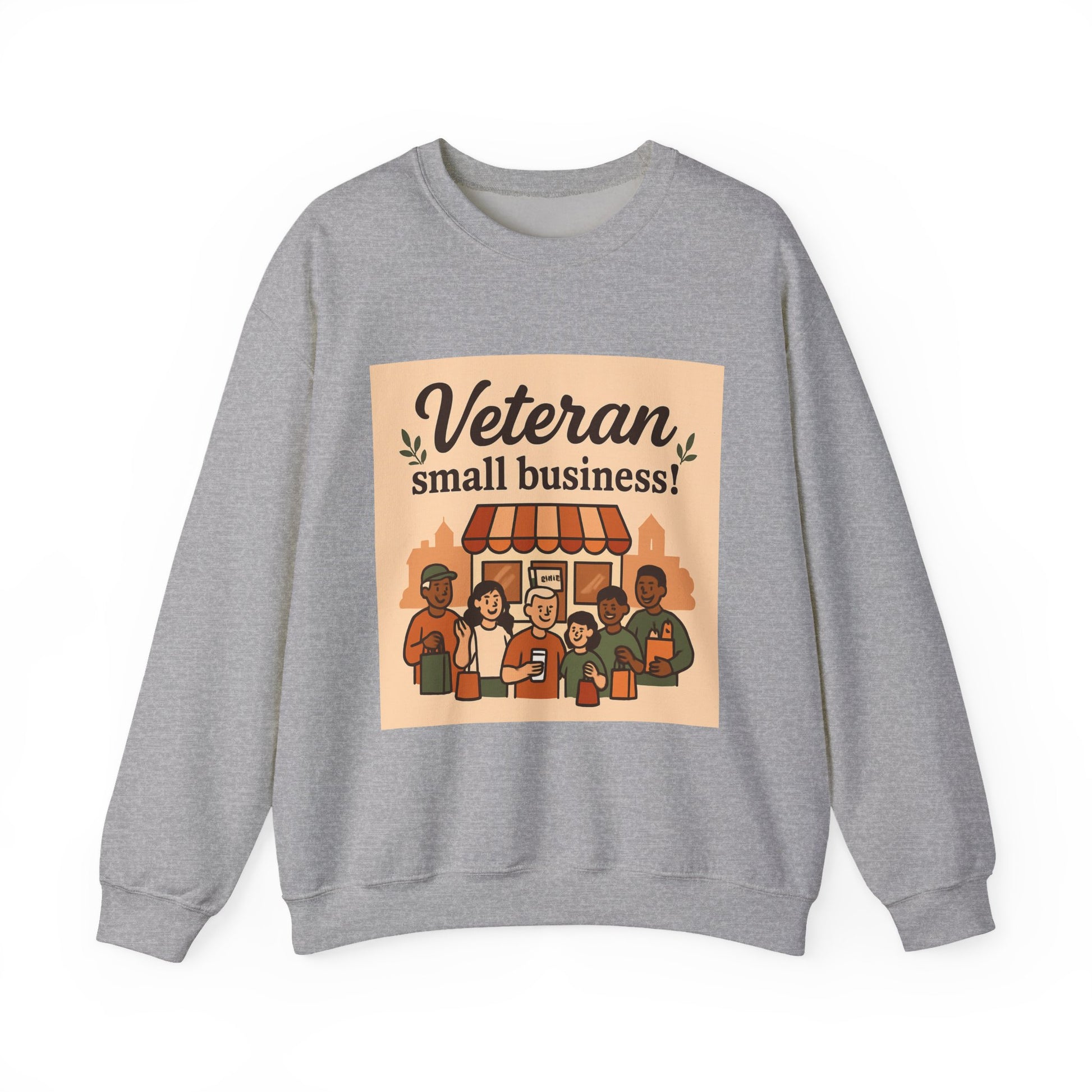 This cozy crewneck brings together warmth, simple style, and a sincere message of community. The medium-heavy cotton-poly blend feels substantial without being bulky, and the classic crew silhouette layers easily over tees or under jackets. Front artwork shows a friendly storefront scene with the headline “Veteran small business!” — warm tones and rounded illustration lines that read like a neighborhood poster. Double-needle stitching at stress points and a tear-away neck label keep this sweatshirt durable and comfortable for everyday wear. It’s a quiet statement piece that slips into mornings at the café, casual meetups, or running errands while showing support for veteran entrepreneurs.